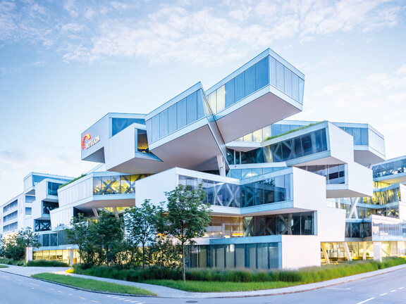 Feuchtigkeitsregulierung in BüroumgebungenDas imposante Gebäude im Stil des Dekonstruktivismus ist Hauptsitz des Pharmaunternehmens Actelion Ltd und wurde von den Schweizer Stararchitekten Herzog & de Meuron entworfen. Die balkenartige Architektur erstreckt sich über sechs Stockwerke und bietet ungewohnte Durch- und Ausblicke, Erholungszonen mit Höfen und Terrassen sowie eine moderne Arbeitsatmosphäre für 350 Mitarbeiter.