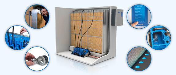 Les modules d'évaporation sont fabriqués sur mesure, modulaires pour faciliter la construction, et peuvent mesurer entre 600 mm et 4 200 mm de largeur et entre 625 mm et 4 000 mm de hauteur.